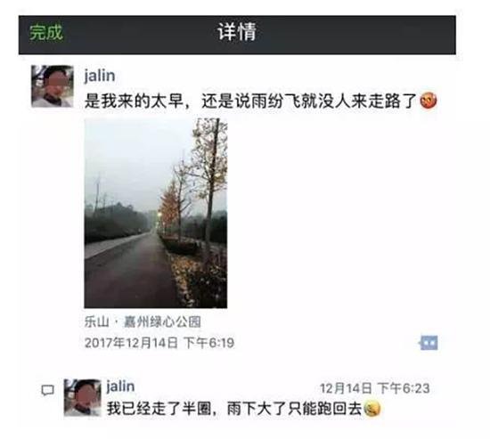 王欣的微信朋友圈显示,12月14日18时19分,她曾发布一条朋友圈,配图是“是我来的太早,还是说雨纷飞就没人来走路了”,配图是一条路,地址显示是乐山市市嘉州绿心公园。约4分钟后,王欣在该条朋友圈留言称,“我已经走了半圈,雨下大了只能跑回去”。