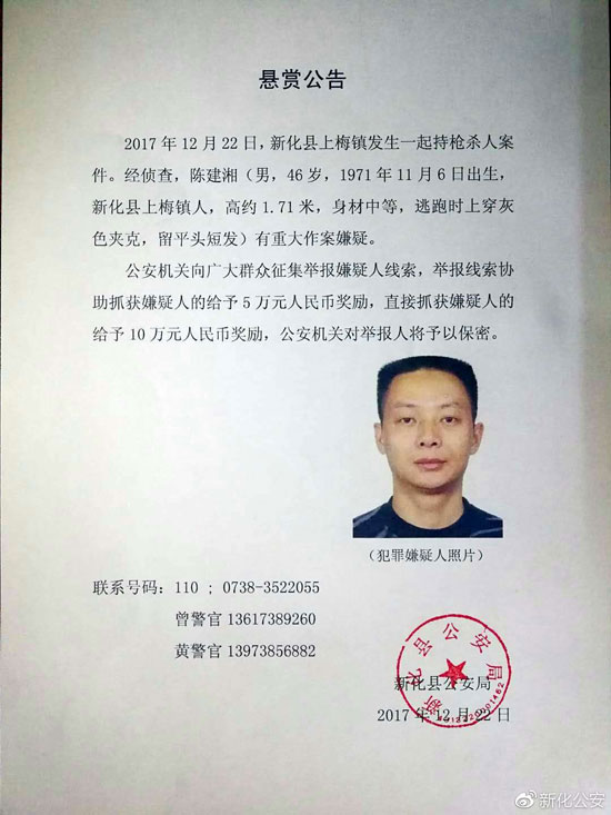 2017年12月22日,新化县上梅镇发生一起持枪杀人案件。经侦查,陈建湘(男,46岁,1971年11月6日出生,新化县上梅镇人,高约1.71米,身材中等,逃跑时上穿灰色夹克,留平头短发)有重大作案嫌疑。