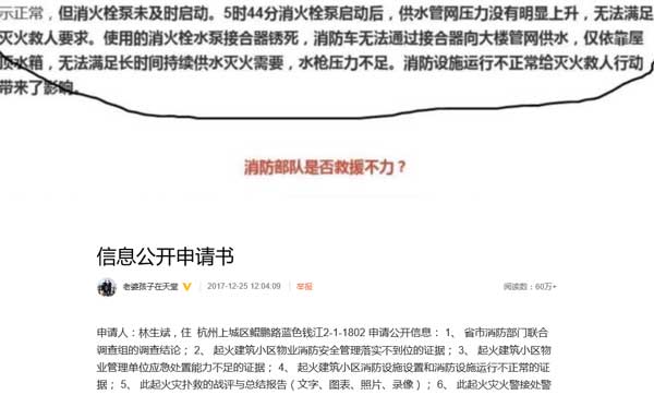 一、信息存在的根据 2017年7月17日,媒体公开报道了杭州市公安消防局参谋长陈骏华先生等领导就社会普遍关注的问题,接受媒体的采访。申请人注意到陈俊华先生阐述的以下内容: 1、陈俊华先生提到:省市消防部门成立了联合调查组,经初步调查,该起放火案中消防部队的灭火救援是符合《公安消防部队执勤战斗条令》和《公安消防部队作战训练安全要则》要求的。