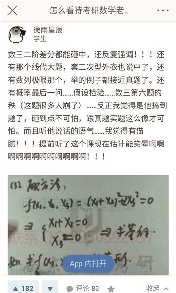 昨天上午,多名网友发微博爆料称,2018年全国硕士研究生统一招生考试数学科目出现“神押题”,一位名为“李林”的教师在考前押题视频中举的例题与实际考研的考试试题十分相似。网友指出,李林押题“命中率”高达80%,甚至连超纲的二阶差分都反复强调。“每年押中几个题已经很牛了,这位老师押中线代大题原题、证明题原题也就罢了,连超纲的二阶微分都猜中,并且反复强调。”