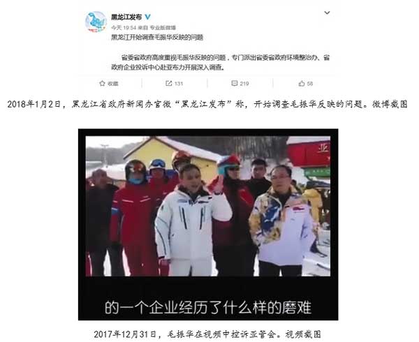2018年1月2日,黑龙江省政府新闻办官微“黑龙江发布”称,开始调查毛振华反映的问题。微博截图