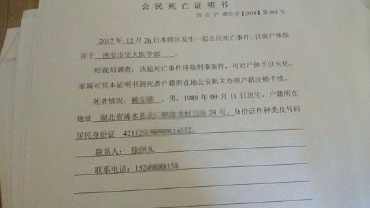 失联后的第五天,去12月29日,家属见到了杨宝德的尸体。据警方出具的“调查意见告知书”显示,发现杨宝德尸体的时间为去年12月26日,地点位于西安灞河永宁坝西侧,系有人报警发现溺亡尸体。另据警方出具的“公民死亡证明书”显示,已排出刑事案件。