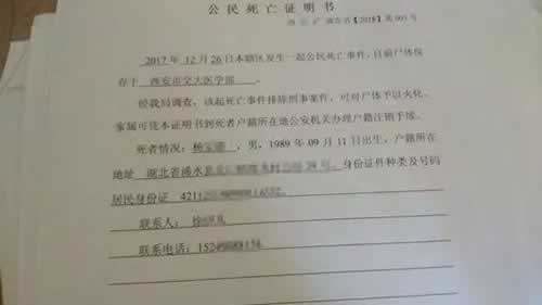 据警方出具的“调查意见告知书”显示,发现杨宝德尸体的时间为2016年12月26日,地点位于西安灞河永宁坝西侧,系有人报警发现溺亡尸体。另据警方出具的“公民死亡证明书”显示,没有证据证明是刑事案件。