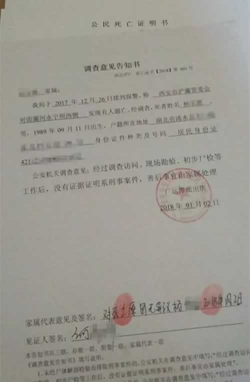 ▲警方出具的“公民死亡证明书”和“调查意见告知书”显示,没有证据证明系刑事案件 图据网络