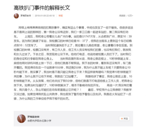 罗海丽老师:网络上闹得沸沸扬扬的拦高铁事件,确实有这么个事情,中间也发生了一些不愉快。但很多说法是不是网上说的那样的,第一我老公没有迟到,我们一家三口是一起进车站的,第二我没有拦动车。