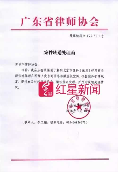 红星新闻从广东省律师协会了解到,今天(1月10日),广东省律师协会已经向深圳市律师协会传达了一份处理函,请深圳市律协就张晴在网上发表的言论进行调查。
