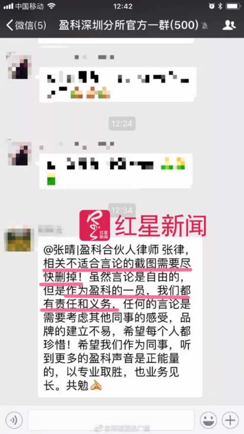 此外,网上流出疑似“盈科深圳分所官方一群”的微信群聊天内容,在图中,有群友要求张晴“相关不适合言论的截图需要尽快删掉”。