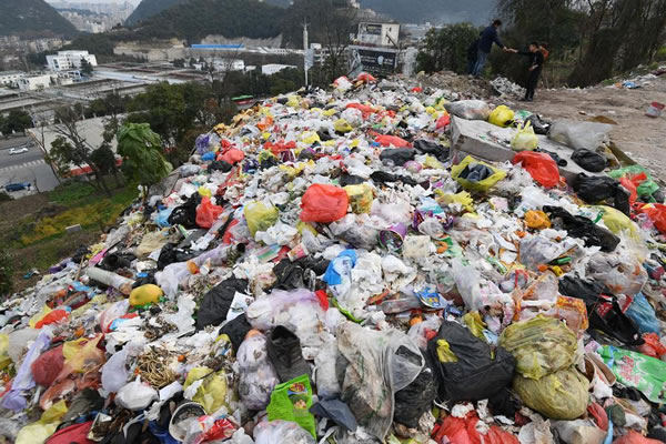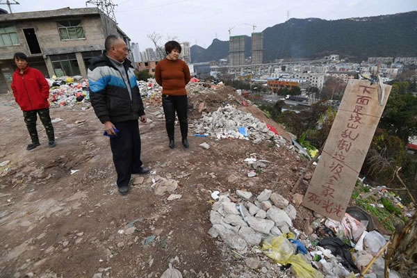 2018年1月10日,贵州省贵阳市,在花溪大道中段灯笼坡的一个移民村庄里,一处道路边堆满了各种生活垃圾,无人清理。路边上还立着一块木板,上边写有“下面是坟山,乱倒垃圾全家死光光”的警示语。附近村民告诉记者,这种用不文明的语言制止不文明行为,这样的“以暴制暴”方式实在不妥,让人感觉很不舒服。