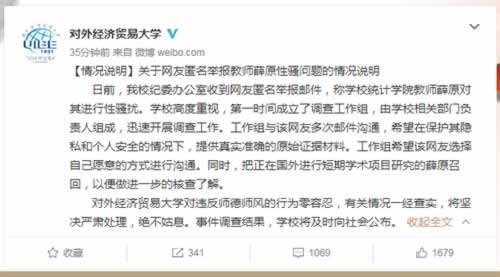 对外经济贸易大学关于网友匿名举报教师薛原性骚问题的情况说明