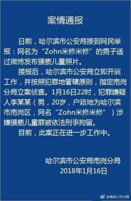 16日晚,哈尔滨市公安局南岗分局发布通报称,日前,哈尔滨市公安局接到王民举报,网名为“Zohn米修米修”的男子通过微博发布猥亵儿童照片。