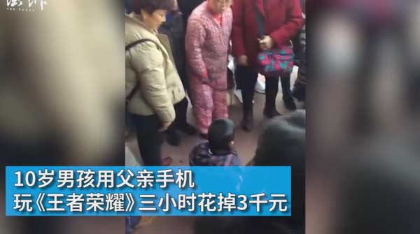 1月16日,贵州贵阳,10岁男童拿父亲手机玩《王者荣耀》花掉3千元,被父亲罚跪在街头乞讨。其父称,他每月工资两三千,罚孩子跪街乞讨是让他明白父母赚钱不易。