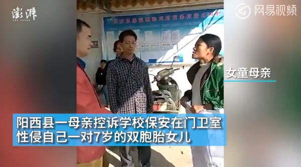 广东阳江一母亲控诉学校保安门卫室性侵7岁双胞胎女童视频