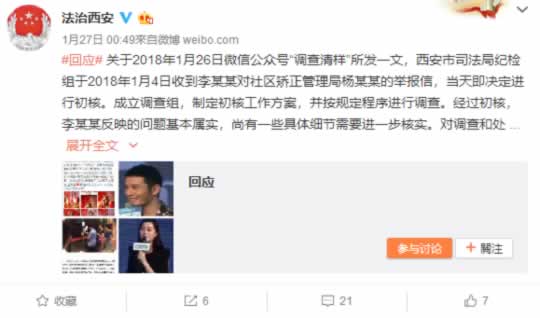 西安市司法局回应称,“关于2018年1月26日微信公众号‘调查清样’所发一文,西安市司法局纪检组于2018年1月4日收到李某某对社区矫正管理局杨某某的举报信,当天即决定进行初核。成立调查组,制定初核工作方案,并按规定程序进行调查。经过初核,李某某反映的问题基本属实,尚有一些具体细节需要进一步核实。对调查和处理结果,会在第一时间公布。”