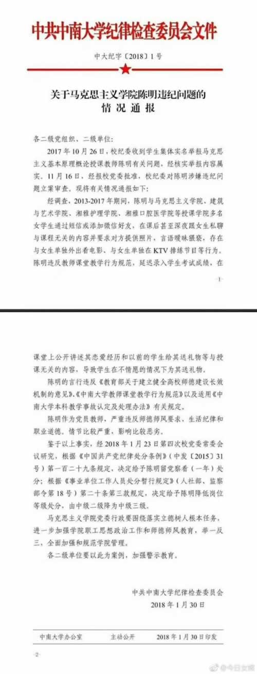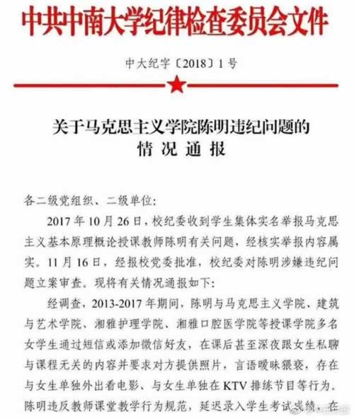 中南大学纪委《关于马克思主义学院陈明违纪问题的情况通报》文件显示,2013年至2017年期间,陈明与马克思主义学院、建筑与艺术学院、湘雅护理学院、湘雅口腔医学院等授课学院多名女学生通过短信或微信添加好友,在课后甚至深夜跟女生私聊与课程无关的内容并要求对方提供照片,言语暧昧猥亵,存在与女生单独外出看电影、与女生单独在KTV排练节目等行为。陈明违反教师课堂教学行为规范,延迟录入学生考试成绩,在课堂上公开讲述其恋爱经历和以前的学生给其送礼物等与授课无关的内容,导致学生在不情愿的情况下为其送礼。
