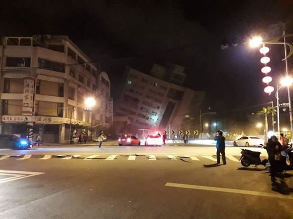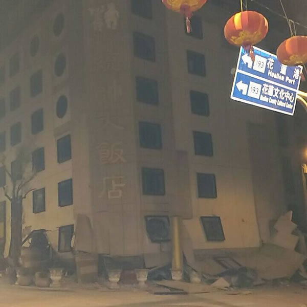 台湾花莲县附近海域6.5级地震,商校街饭店大楼倒塌。据联合新闻网报道,台湾花莲县自周日(4日)起便地震不断,令市民担惊受怕。花莲近海周二(6日)深晚11时50分左右,再发生6级地震,震源深度达10千米,全台均感到震动。其中以花莲市及宜兰南澳震感最强,震度达7级,而合欢山震度亦达5级,花莲 、宜兰、新北、台北4级以上。