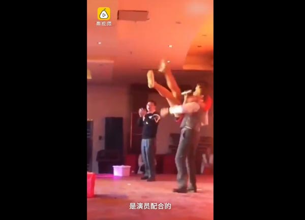 据该公司工作人员表示,公司前天晚上在当地华泰酒店举办的年会。大约在下午两点多,演员宋某登上舞台与公司员工互动。期间,胡某与其互动频繁,他便邀请胡某上台。网上传播的视频显示,胡某将身穿红色裙子脚穿高跟鞋的宋某高高抱起,然后松手将宋某摔在舞台上,舞台上另一位男子随后上前询问被摔倒在地的宋某,视频中传来了鼓掌和欢笑声。