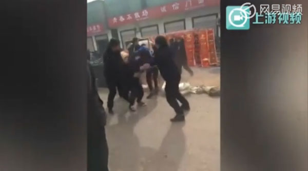 网传视频显示,两名城管队员挥拳朝一名黑衣年轻男子打去。这时,一穿蓝色羽绒服的小伙赶来帮忙,踢了城管队员一脚。接着,两名城管分开,一人追小伙,一人继续与黑衣男子干仗。不远处,一名中年男子和另一城管队员正在对打。现场混乱不堪,还有人爆了粗口。