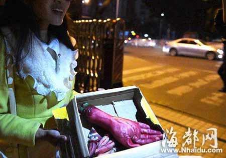“一只血色的‘断掌’和‘断指’,还有一张卖家的信息。”周小姐说,她刚划开包裹时以为是螃蟹,但仔细一看,是“碎尸的断掌”,她被吓得不轻。后来房东把包裹拆开后,发现里面的东西都是橡胶道具,只是做得非常逼真,看起来有血有肉,真的很吓人。
