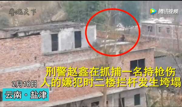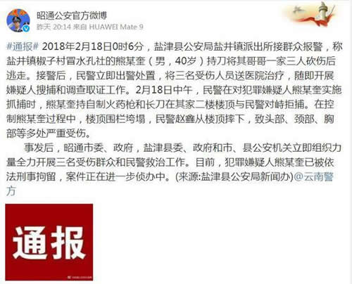 #通报# 2018年2月18日0时6分,盐津县公安局盐井镇派出所接群众报警,称盐井镇椒子村冒水孔社的熊某奎(男,40岁)持刀将其哥哥一家三人砍伤后逃走。接警后,民警立即出警处置,将三名受伤人员送医院治疗,随即开展嫌疑人搜捕和调查取证工作。2月18日中午,民警在对犯罪嫌疑人熊某奎实施抓捕时,熊某奎持自制火药枪和长刀在其家二楼楼顶与民警对峙拒捕。在控制熊某奎过程中,楼顶围栏垮塌,民警赵鑫从楼顶摔下,致头部、颈部、胸部等多处严重受伤。