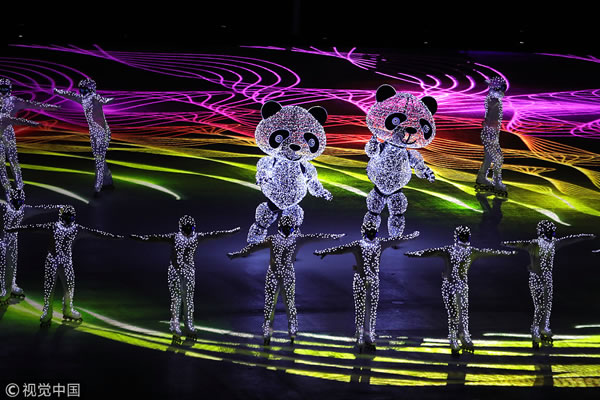 表演中贯穿始终的两只“滑冰”的熊猫木偶让人印象深刻。张艺谋阐述这一创作称,熊猫是中国的一个重要形象符号,是文化的使者。