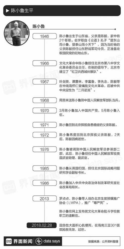 2018年3月1日上午,陈毅元帅之子陈小鲁因急性大面积心肌梗死,在海南三亚301医院抢救无效,辞世。据了解,陈小鲁昨日白天一切正常,晚间约21:20突然感觉不适呼叫妻子粟裕之女粟惠宁。随后,陈小鲁在被急救车送往海棠湾301医院的路上,停止心跳、呼吸。
