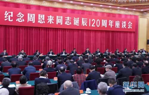 1日,在人民大会堂,习近平和其他常委同志全体出席周恩来同志诞辰120周年座谈会,习近平发表重要讲话。