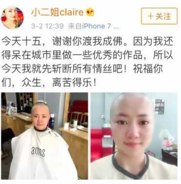 今天(3月2日),这位26岁崔姓女士直接在微博上晒出流泪剃头照,称“谢谢你渡我成佛”。