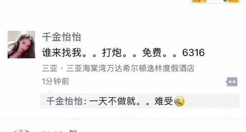 “免费招嫖” 这一全新概念,恕我孤陋寡闻,我还真是第一次听说,昨天赫然出现在三亚公安局的新闻通报中,说的就是这两天刷屏的靓女“千金怡怡”3月1日在三亚万达希尔顿酒店6316房公开约炮事件。