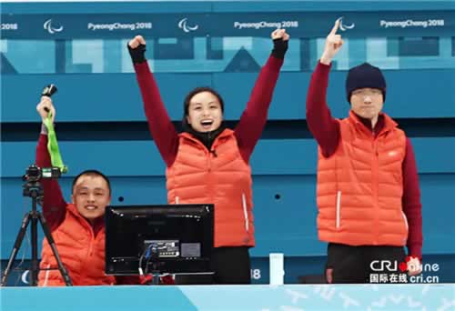 在本届冬残奥轮椅冰壶赛中,中国队一路过关斩将,12支队伍中位列第三晋级四强。半决赛1分险胜三届赛事冠军加拿大队后,中国队满怀信心挺进决赛。由王蒙、刘微、陈建新、王海涛、张强组成的中国队延续了昨天半决赛时的出色状态,八局比赛过后,双方战成5-5进入加赛局。在加赛局比赛里,随着挪威队最后一投出现失误,中国队提前拿到一分锁定胜局。最终中国轮椅冰壶队以6-5击败对手,登上奥运最高领奖台。这是中国代表团在所参加的历届冬季残奥会上斩获的首枚奖牌,也是首枚金牌。冬季残奥会的赛场上首次奏响了中国国歌。