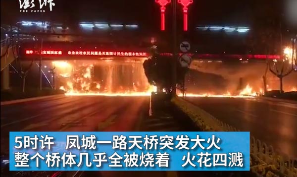 3月19日5时许,陕西西安凤城一路天桥突发大火,整个桥体几乎全被烧着,火花四溅。据当地媒体报道,此次事故由天桥上缠绕的彩灯短路引起,目前天桥已被封闭。