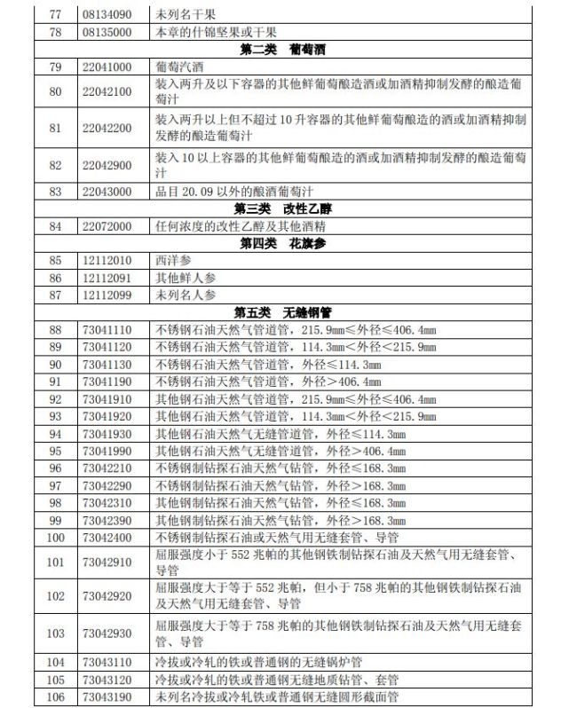 该清单暂定包含7类、128个税项产品,按2017年统计,涉及美对华约30亿美元出口。第一部分共计120个税项,涉及美对华9.77亿美元出口,包括鲜水果、干果及坚果制品、葡萄酒、改性乙醇、花旗参、无缝钢管等产品,拟加征15%的关税。第二部分共计8个税项,涉及美对华19.92亿美元出口,包括猪肉及制品、回收铝等产品,拟加征25%的关税。