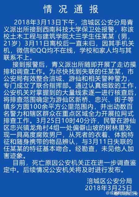 警方通报称:2018年3月13日下午,涪城区公安分局青义派出所接到西南科技大学保卫处报警,称该校土木工程与建筑学院大三学生任某某(男,21岁)3月11日离校后一直未归,因其手机关机,微信和QQ均不在线,学校和家人均与其联系不上。