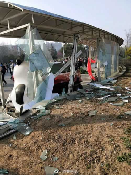北京青年报记者从网友爆料的照片中看到,一辆红色的汽车撞上一个候车亭,候车亭的玻璃被撞碎。汽车下面有一摊血迹,事故现场有多名学生围观。