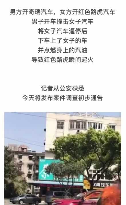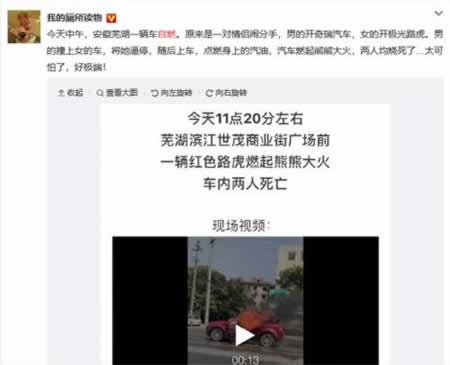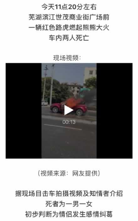据网友曝料:今天中午,安徽芜湖一辆车自燃。原来是一对情侣闹分手,男的开奇瑞汽车,女的开极光路虎。男的撞上女的车,将她逼停,随后上车,点燃身上的汽油,汽车燃起熊熊大火,两人均烧死了…太可怕了,好极端!