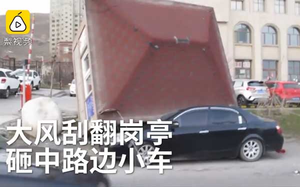 实拍新疆狂风刮翻岗亭砸中路边小车视频
