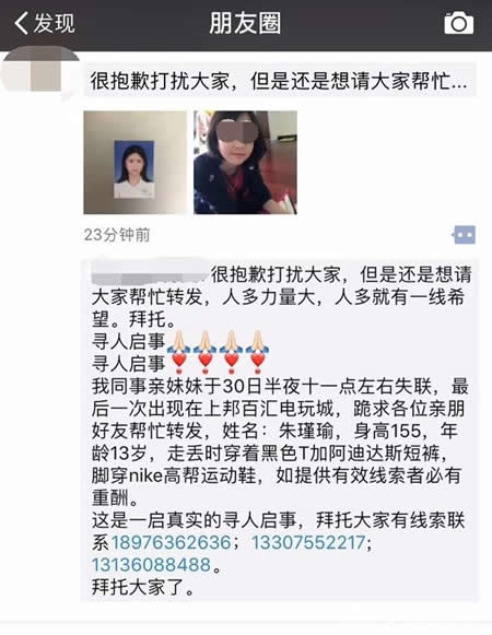 3月31日早晨,海口市居民的朋友圈被一则寻人启事刷屏了。原来,3月30日下午,朱某某被家人送往海口市上邦百汇城玩耍,其随身携带了手机及充电宝。结果再也没有回来。