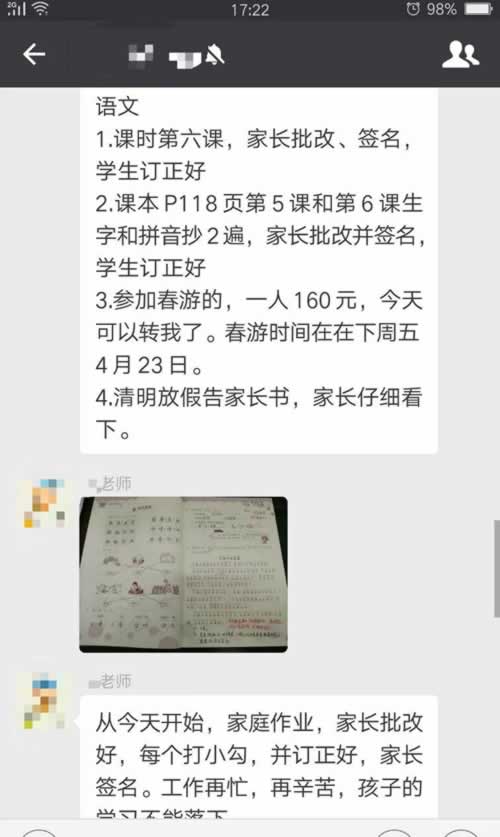 老师还说了这样一句话“工作再忙,再辛苦,孩子的学习不能落下”。这句话说的很理所应当的感觉,作为家长自然不会不管孩子的学习,但这就成了“家长批改作业”的理由?