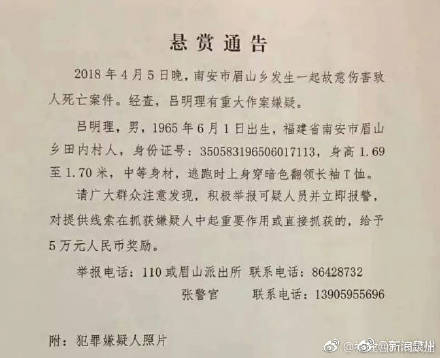 (副标题:南安眉山乡发生一起命案 警方发布悬赏公告)