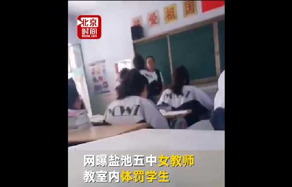 视频显示,在盐池县第五中学的一间教室内,一名女教师在全班学生面前,用疑似棍棒轮番抽打7名女学生背部和头部,边打边说:“还跑?不好好学习,你还跑不跑?”