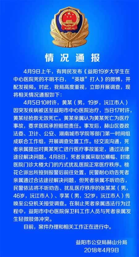 针对此事,益阳市公安局赫山分局官方微博@赫山公安分局 4月9日发布情况通报称,4月9日上午,有网友发布《益阳19岁大学生在中心医院死的(应为:得)不明不白,“英雄”打人》微博,并配发视频。对此,我局高度重视,立即展开调查。