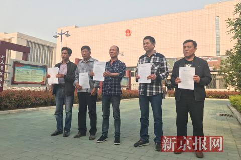 5人拿着无罪判决书在安徽省高院门口留影。新京报记者 曹林华 摄