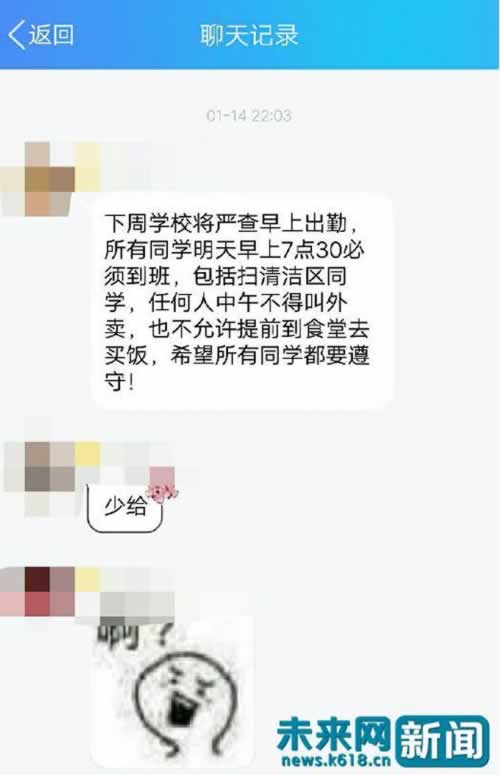 校方禁止学生叫外卖且不许提前去食堂买饭聊天记录(受访者供图)