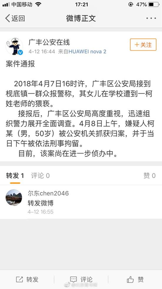 今天下午,广丰县公安局发布通报称,2018年4月7日16时许,广丰区公安局接到枧底镇一群众报警称,其女儿在学校遭到一柯姓老师的猥亵。接报后,广丰区公安局高度重视,迅速组织警力展开全面调查。4月8日上午,嫌疑人柯某(男,50岁)被公安机关抓获归案,并于当日下午被依法刑事拘留。目前,该案尚在进一步侦办中。