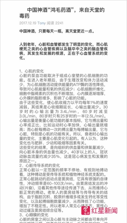他称,该文主要内容来自“非凡医品”公众号文章,原文标题《奇葩:67种药材能治47种病1169个广告的国药鸿毛药酒坑人到什么时候》(注:原文标题为“鸿毛”)。4月13日,红星新闻检索发现,“非凡医品”公众号里的该文章仍可访问阅读。