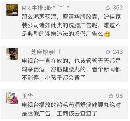 引起笔者注意的是,很多网友的留言矛头均不约而同地指向了鸿茅药酒的广告。