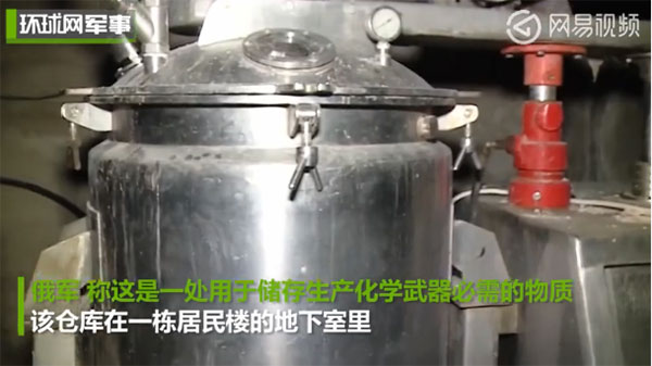 俄罗斯电视台17号报道说,俄罗斯军方在杜马镇发现了一处化学武器实验室。俄罗斯军方的防控化武专家亚历山大·罗季奥诺夫,展示了这处据称属于叙利亚反政府武装的化武实验室。亚历山大·罗季奥诺夫称:“我们发现了被禁止化学武器组织明令禁用的化学制剂,这里有硫二甘醇(国际监控化学品 化武原料)、二氧醇胺、芥子气,还有一罐氯气。”