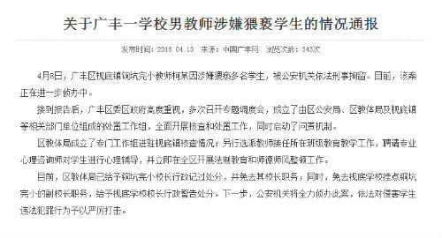 4月13日,中国广丰网官方网站发布关于广丰一学校男教师涉嫌猥亵学生的情况通报。