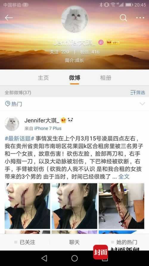 4月23日凌晨4点20分,贵州六盘水18岁女孩刘雪琪通过个人微博“发声”。这是她在3月15日凌晨4点左右在合租屋所经历遭遇发生后的首次。发声事件为她被合租女生带回的三位男生围殴,且其中一男生还用菜刀将其砍伤,至面部缝合200多针。喊话对象除合租女孩张玉柔及其带回的三位男生,还有贵阳警方。4月23日晚9点,封面新闻独家报道了此事。