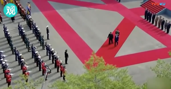 据韩联社报道,在传统仪仗队的护送下,两位领导人从军事分界线徒步走到介于“自由之家”和“和平之家”的板门店广场。韩朝两国领导人一起检阅了韩军仪仗队,以下为检阅视频: