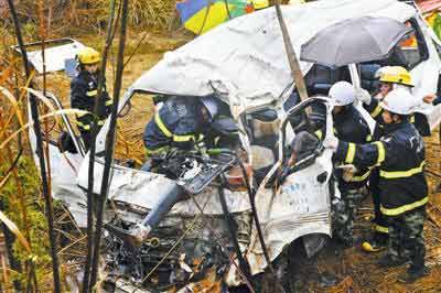根据事发现场群众的描述,面包车在下坡时突然撞断了路边的两根水泥隔离桩,“在空中飞了五六米,摔在路边2米深的土坑中。”现场图片显示,面包车严重变形,车头瘪凹,车体扭曲。